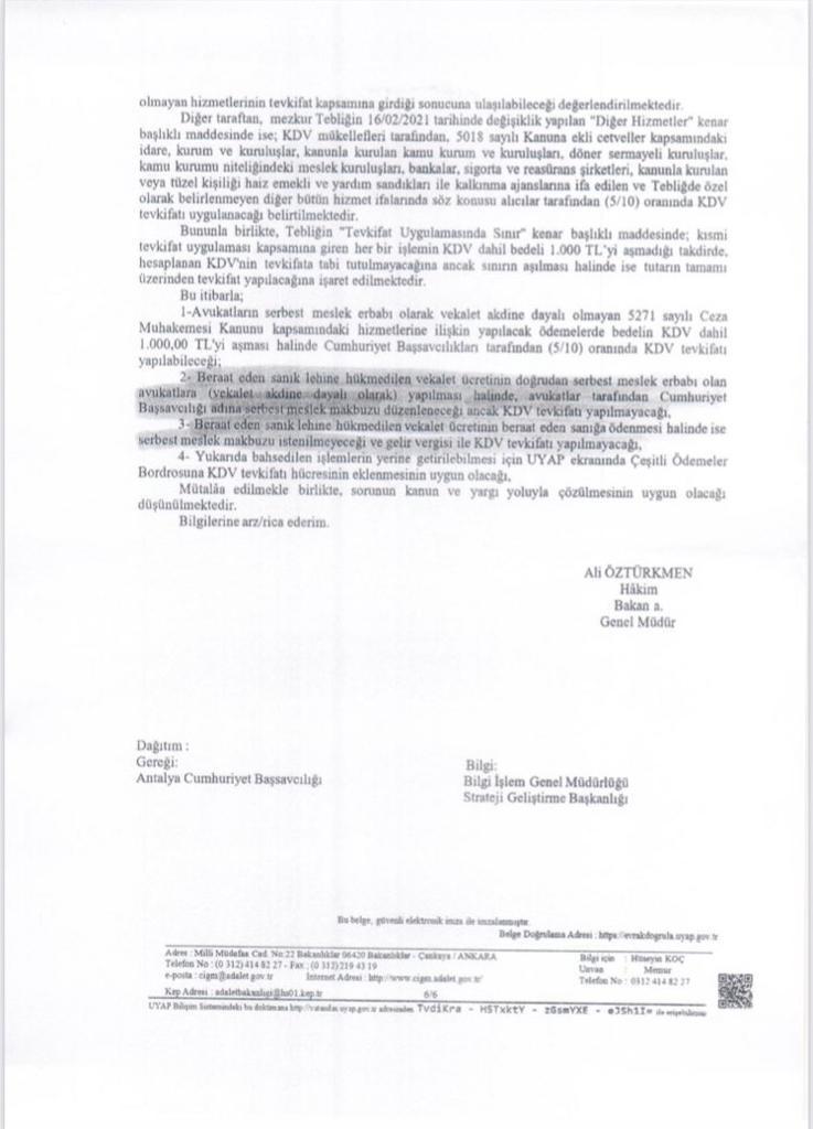 “1- Avukatların serbest meslek erbabı olarak vekalet akdine dayalı olmayan 5271 sayılı Ceza Muhakemesi Kanunu kapsamındaki hizmetlerine ilişkin yapılacak ödemelerde bedelin KDV dahil 1.000,00 TL’yi aşması halinde Cumhuriyet Başsavcılıkları tarafından (5/10) oranında KDV tevkifatı yapılabileceği;